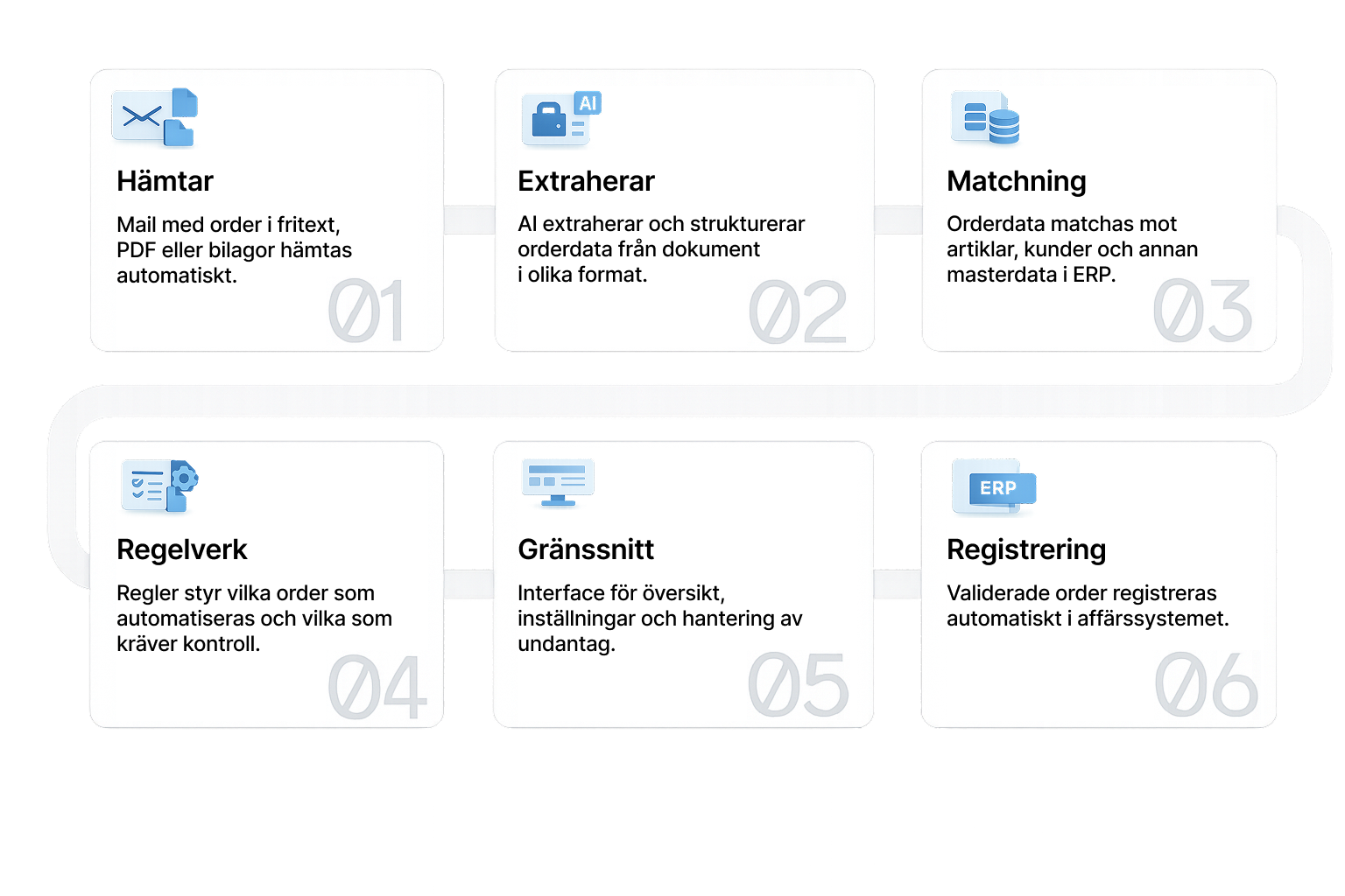 AI-baserad orderautomatisering innebär att inkommande order tolkas, struktureras och registreras automatiskt i affärssystemet. Processen kombinerar AI för att förstå orderinformation med affärsregler och matchning mot företagets masterdata. Resultatet blir att majoriteten av order kan hanteras automatiskt, medan avvikelser enkelt fångas upp för manuell kontroll.